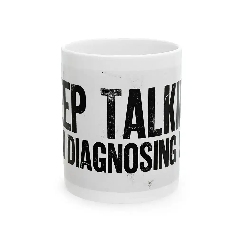 Perfect for the friend with a dry sense of humor, this mug features bold, slightly distressed text that reads like a private joke. It is an ideal gift for medical professionals or psychology students who can appreciate a little clinical sarcasm with their morning coffee. The clean white design ensures the witty message stands out on any desk.